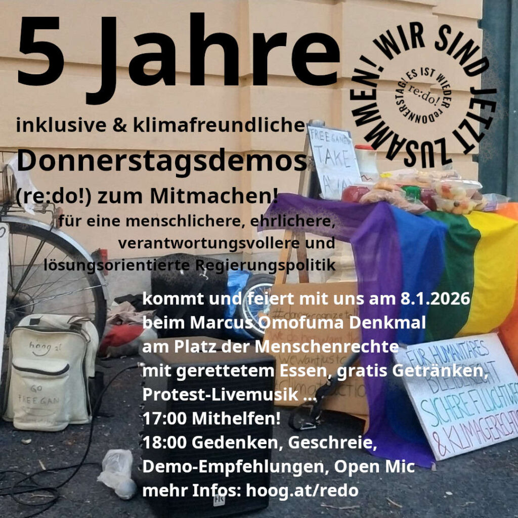 8. 1. 2026, Platz der Menschenrechte in Wien: 5 Jahre inklusive & klimafreundliche Donnerstagsdemos (re:do!) für eine menschlichere, ehrlichere, verantwortungsvollere und lösungsorientierte Regierungspolitik.