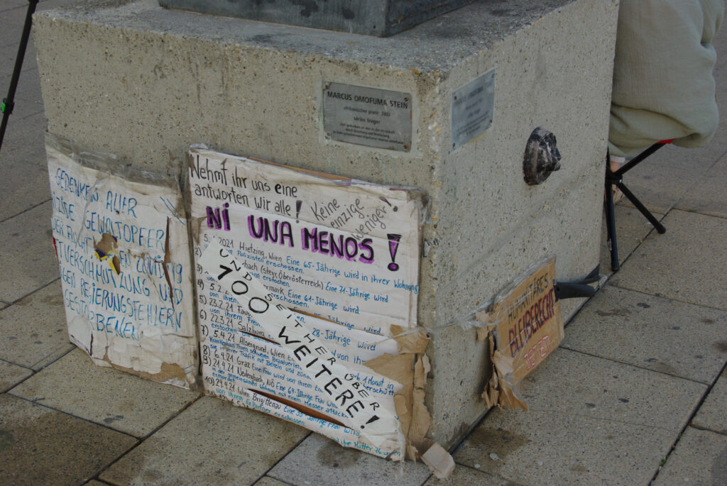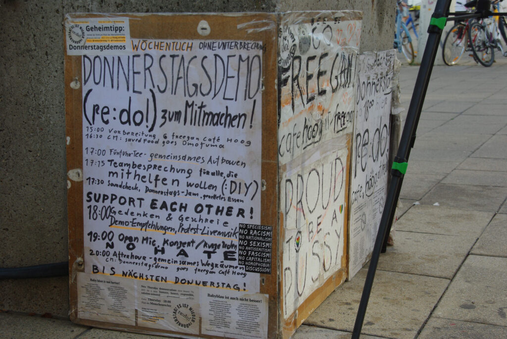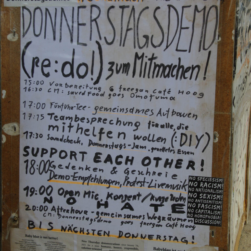 Da die Donnerstagsdemo inklusiv, klimafreundlich und zum Mitmachen ist, haben wir vor einiger Zeit unser Programm auf ein Schild gemalt, und an die anderen Schilder gehängt, mit denen wir jede Woche das Marcus-Omofuma-Denkmal schmücken.