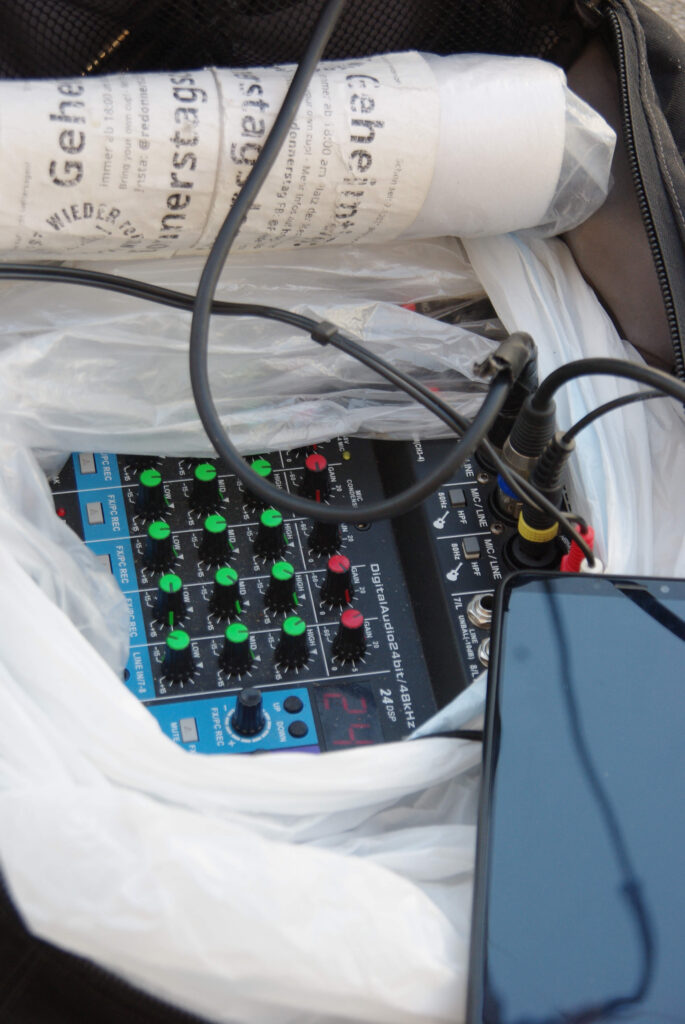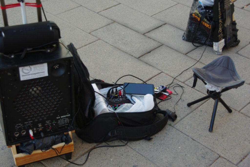 Für Singende gibt es zwei Mikrophone und für alle ein 7-Kanal-Mischpult. Weil wir Klimaschutz nicht nur fordern sondern auch selbst leben wollen, wird unsere Sound-Anlage ohne stinkendem Dieselaggregat nur mit Akkus betrieben. (Wer unbedingt 220V braucht, kann die vielleicht vom Dschungel bekommen.) Wenn Ihr einen Soundcheck machen wollt, ist das am besten von 17:30 bis 18:00 möglich. Wenn Ihr länger spielen wollt, können wir das Gedenken & Geschreie (und die Demoempfehlungen der Woche) etwas kürzer machen. Dann könnt Ihr schon ab 18:30 loslegen. Die Demo ist bis 21:00 angemeldet. (In Ausnahmefällen können wir das auch gerne verlängern. Dabei muß aber dann auf die Nachbarn Rücksicht genommen werden. Da wir aus antiklassistischer Rücksicht auf alle, die kein Internet haben, immer fix am Platz der Menschenrechte zu finden sind und bisher auch nie so viele Leute waren, daß ein Marschieren an einen anderen Ort in Frage kam, müssen uns die Nachbarn jede Woche ertragen. Und konsequente Inklusion bedeutet natürlich auch, darauf Rücksicht zu nehmen, damit sich wirklich alle wohl fühlen.)