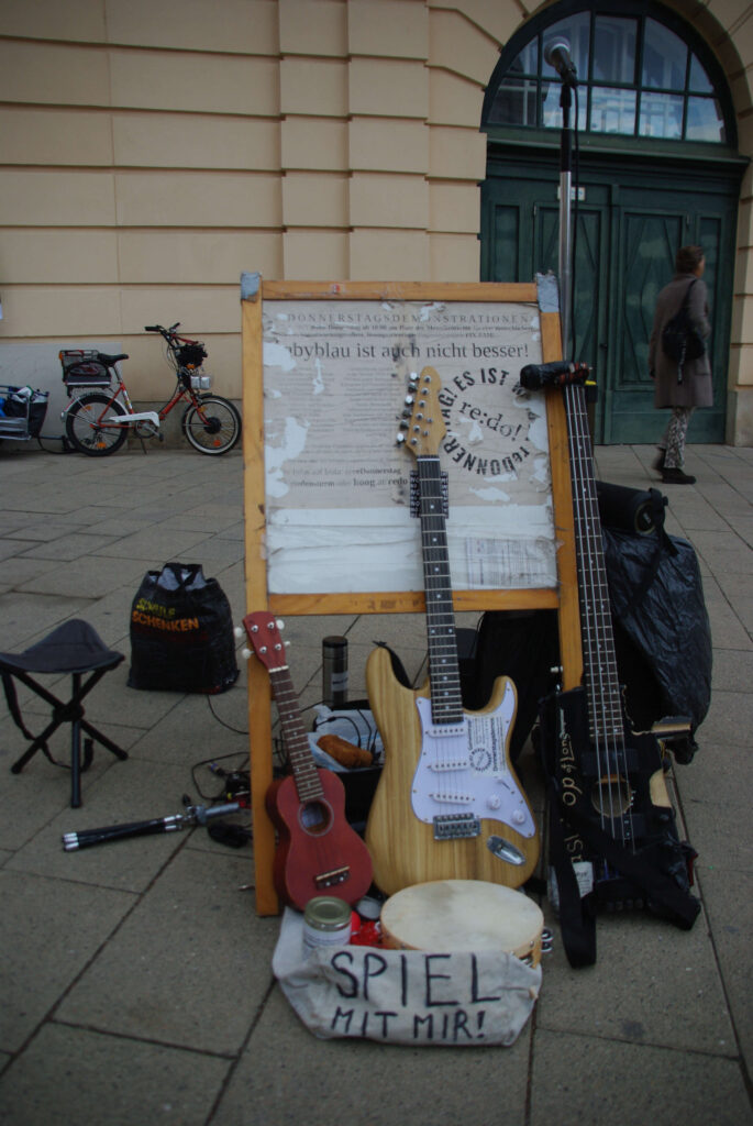 Für Singende gibt es drei Mikrophone und für alle ein 7-Kanal-Mischpult. Weil wir Klimaschutz nicht nur fordern sondern auch selbst leben wollen, wird unsere Sound-Anlage ohne stinkendem Dieselaggregat nur mit Akkus betrieben. (Wer unbedingt 220V braucht, kann die vielleicht vom Dschungel bekommen.) Wenn Ihr einen Soundcheck machen wollt, ist das am besten von 17:30 bis 18:00 möglich. Wenn Ihr länger spielen wollt, können wir das Gedenken & Geschreie (und die Demoempfehlungen der Woche) etwas kürzer machen. Dann könnt Ihr schon ab 18:30 loslegen. Die Demo ist bis 21:00 angemeldet. (In Ausnahmefällen können wir das auch gerne verlängern. Dabei muß aber dann auf die Nachbarn Rücksicht genommen werden. Da wir aus antiklassistischer Rücksicht auf alle, die kein Internet haben, immer fix am Platz der Menschenrechte zu finden sind und bisher auch nie so viele Leute waren, daß ein Marschieren an einen anderen Ort in Frage kam, müssen uns die Nachbarn jede Woche ertragen. Und konsequente Inklusion bedeutet natürlich auch, darauf Rücksicht zu nehmen, damit sich wirklich alle wohl fühlen.)